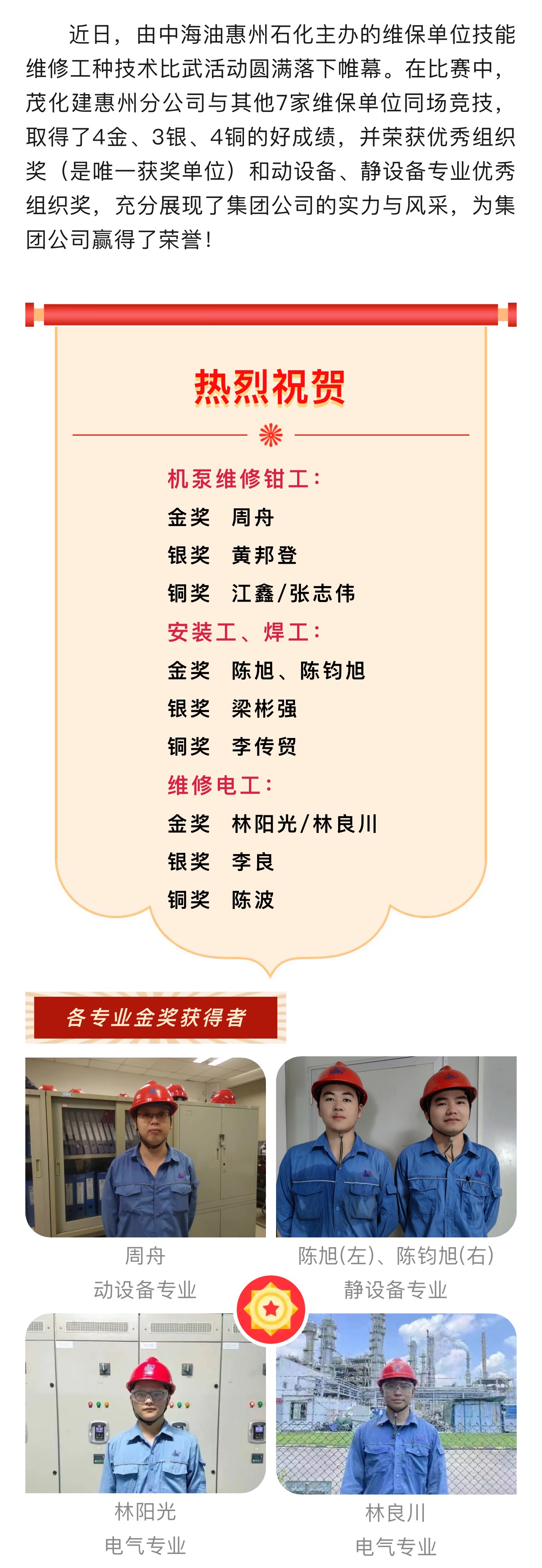 喜訊:惠州分公司在惠州石化維保單位技能維修工種技術(shù)比武中獲佳績