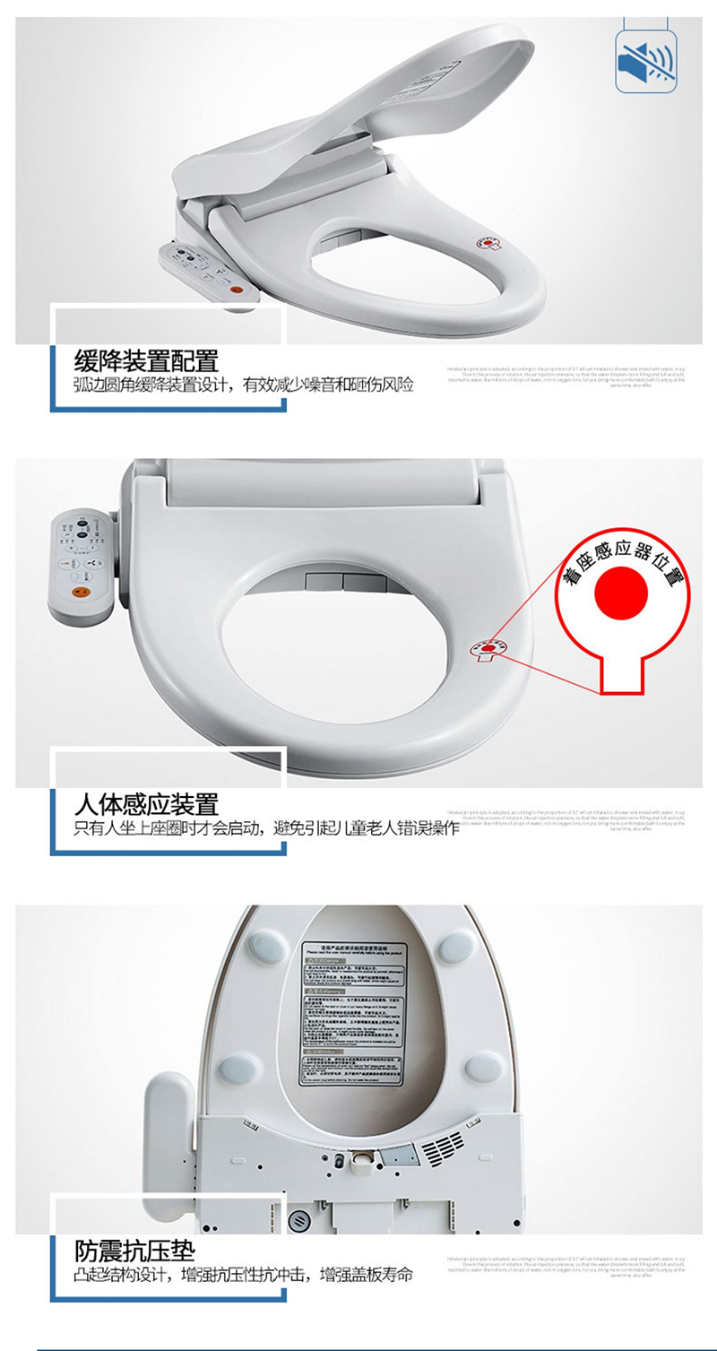 13、便座緩沖:便蓋和座圈均帶緩降裝置,緩緩下落,避免沖擊;